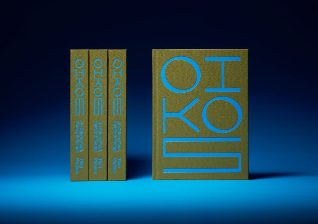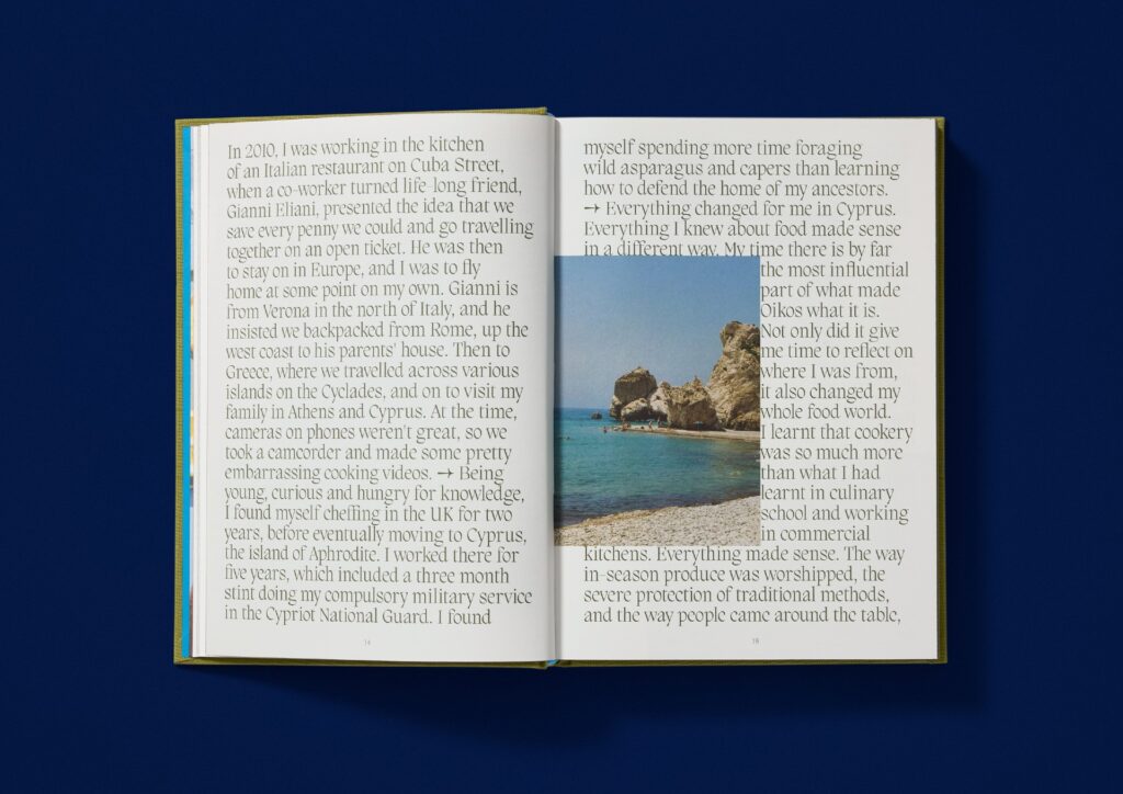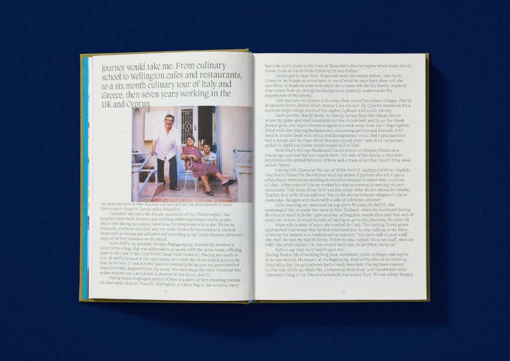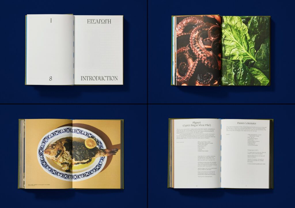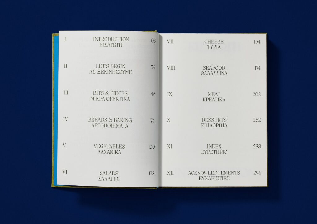Judges’ comments With the title embedded in neon blue against the green clothbound background, the contrasting colours stand-out just as this book does on the shelf. The title’s blue is consistent throughout and sends you straight to the Aegean, as does the thoughtfully used custom Greek alphabet, based on the Migra typeface. This book balances storytelling and functionality, offering a glimpse into a family album and their heirloom recipes.