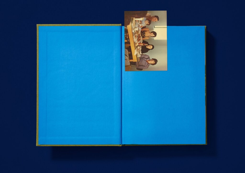 Format: 245 x 175mm, 296pp. Section sewn, lay flat binding, foiled book cloth, edge-sprayed, tipped-in physical postcard (old family photo)