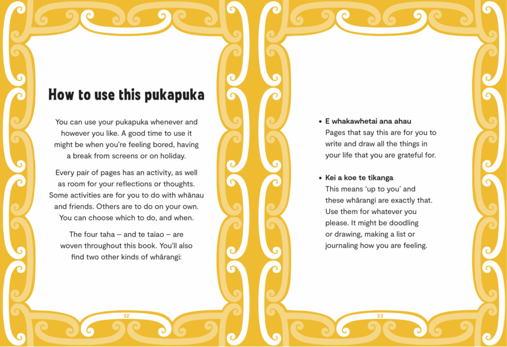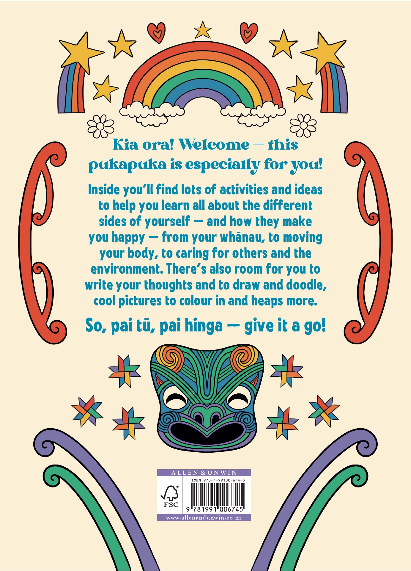 "Loosely based on the author's bestselling Whakawhetai: Gratitude, Piki te Ora: Your Wellbeing Journal is aimed towards a younger readership. Given that, illustrator Huriana Kopeke-Te Aho (Tūhoe/Ngāti Porou/Rongowhakaata/Te Āti Haunui-a-Pāpārangi/Ngāti) created illustrations are slightly retro, colourful and playful, while incorporating Māori symbols and elements throughout.