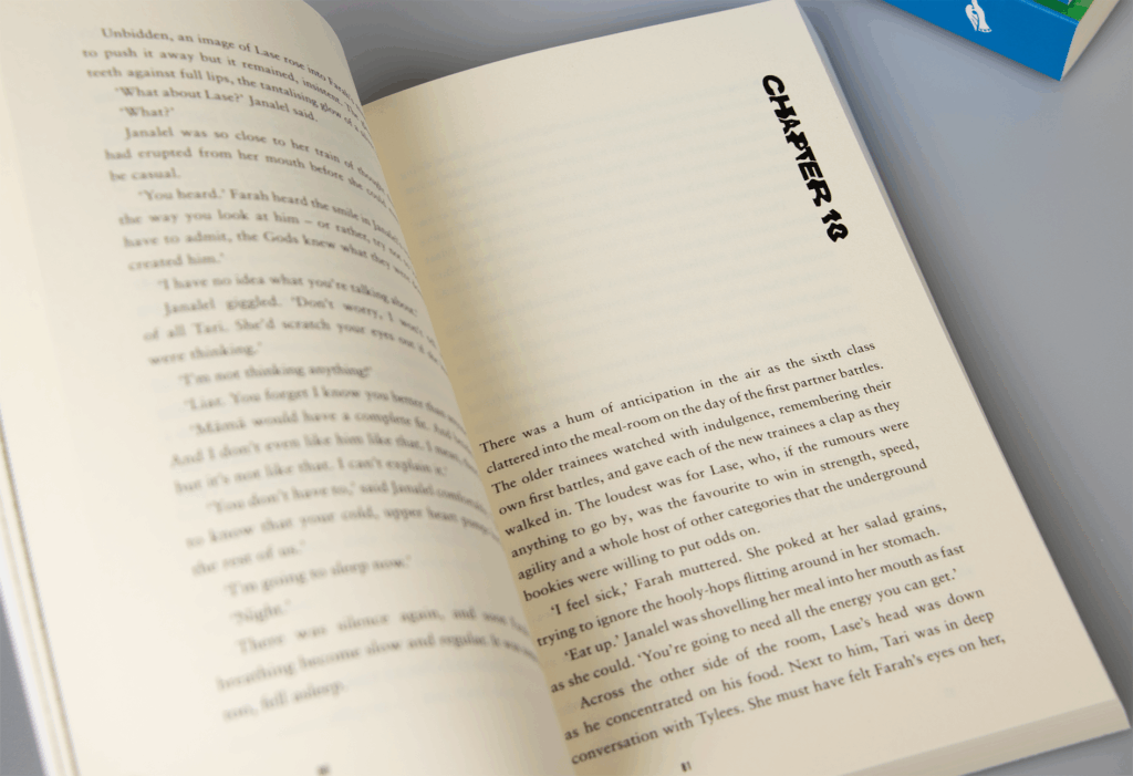 Typography continues the narrative tone. Chapter mastheads are warped and digitally manipulated to suggest corrupted data streams, while page numbers subtly migrate across spreads, mirroring Farah’s temporal dislocation. Interior blank pages feature dark, noisy textures to reflect the fragmentation.