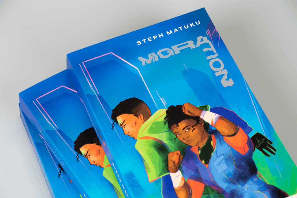 Design Statement: The cover design for Migration reflects the boldness and chaos of the narrative, drawing on 60s sci-fi posters, street art, and the hyper-saturated energy of Takashi Murakami. Mixed-media textures combine with distorted forms to channel the story’s grit and intensity. Farah, with her braided battle hair and headset, stands apart from typical sci-fi leads, visually intense, imperfect, and central to the composition.