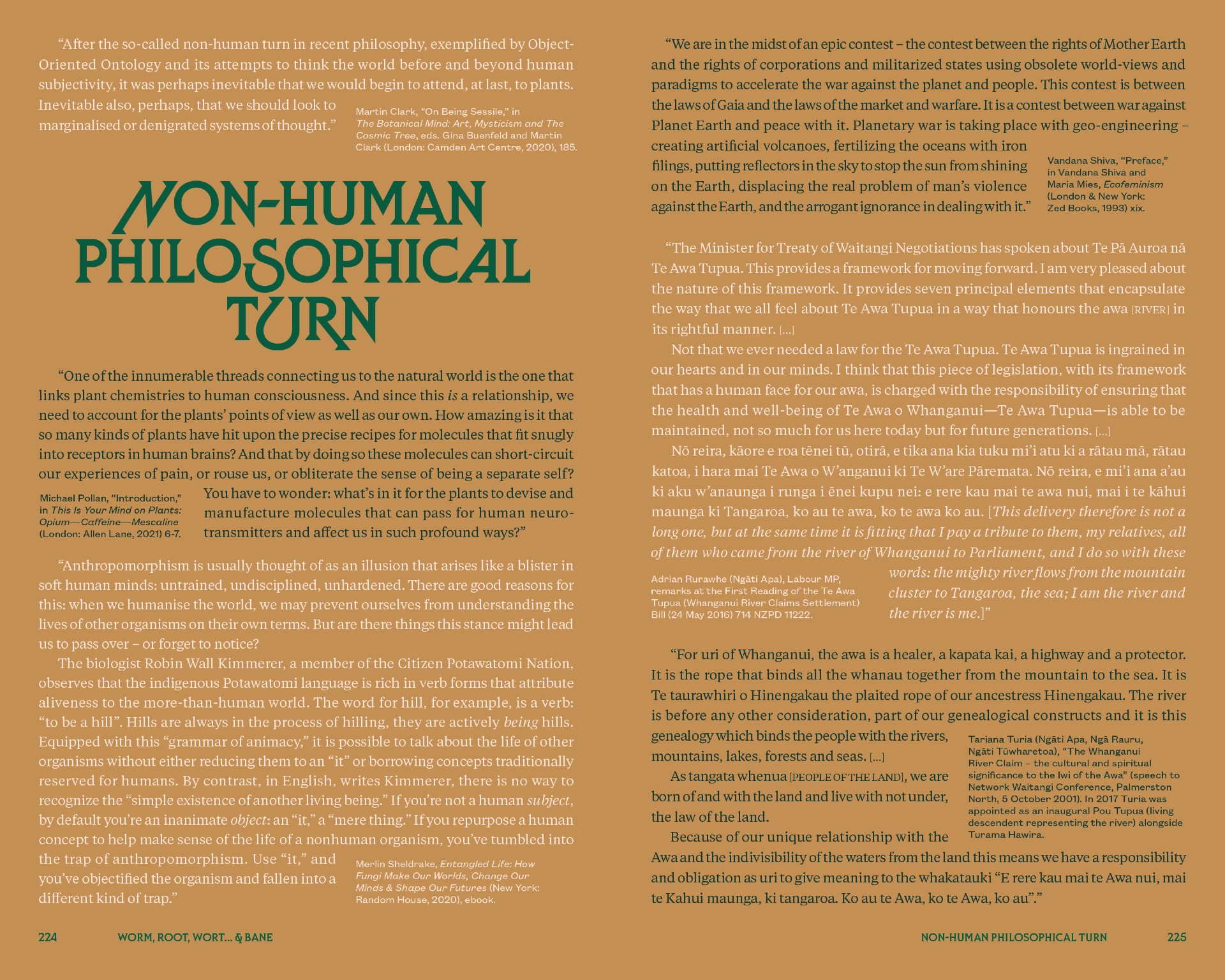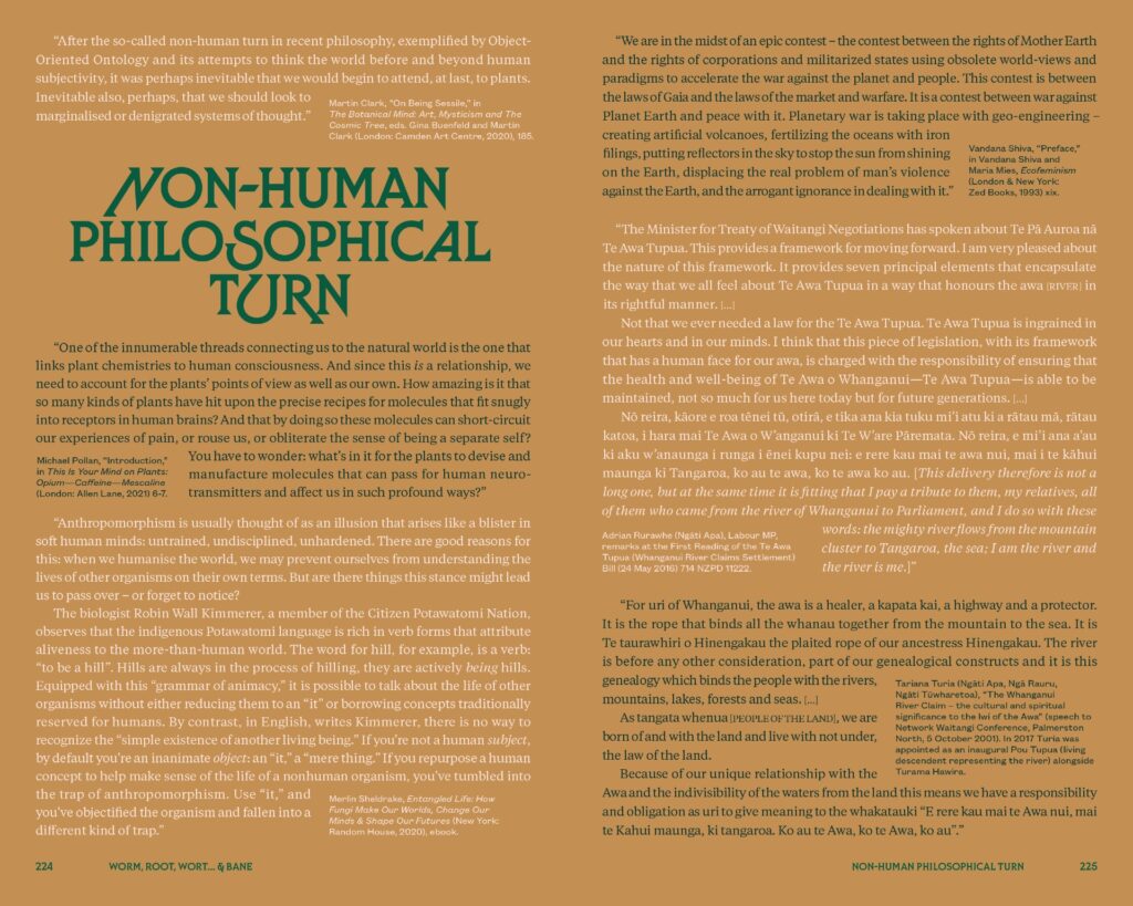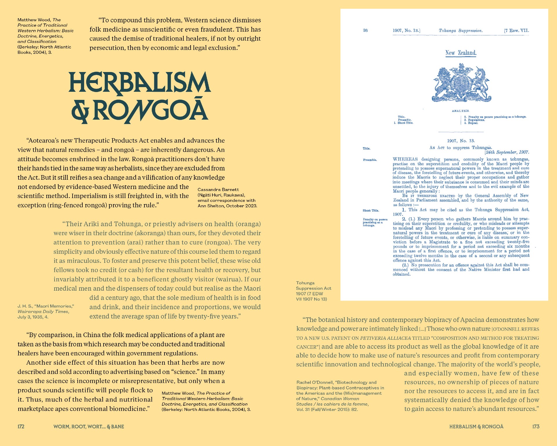 “The publisher required this book to be the same size as their other titles; 127 x 203mm. While these other titles had much smaller page counts, 48 to 64 pages, the ambition for worm, root, wort.. & bane required it run to 312 densely packed pages. In the early planning stages we had thought this book would have larger dimensions, and the relatively tiny size requirement was, at first, a bit frustrating. Ultimately though the small size worked for us, making all the disparate pieces of content bunch up, rub shoulders, and jostle for space with each other, giving the book an energy that reflected its spirit.”